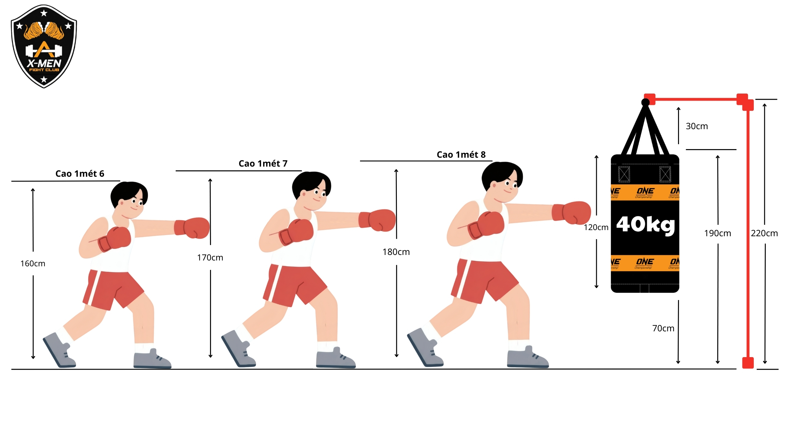 Chiều cao 120cm, vừa vặn cho các cú jab – cross – hook – uppercut.